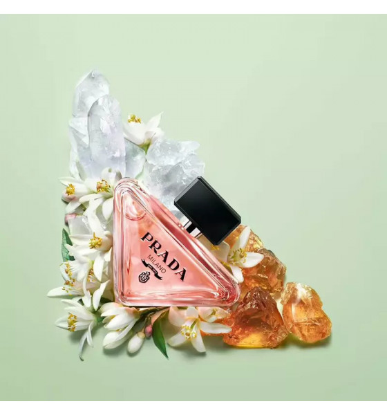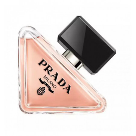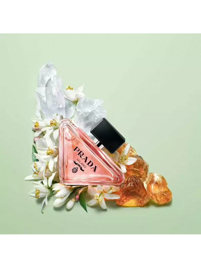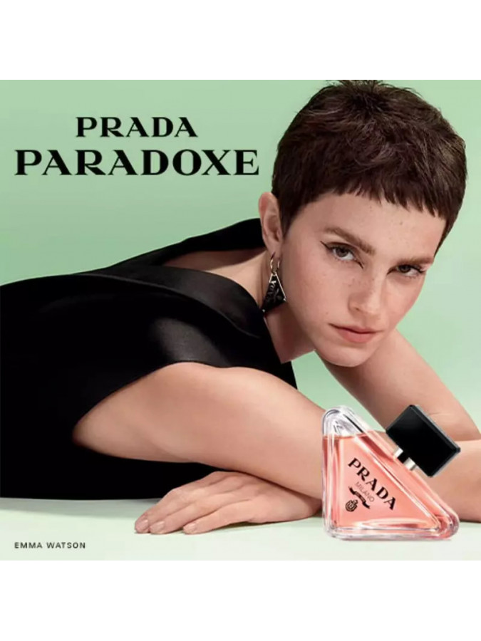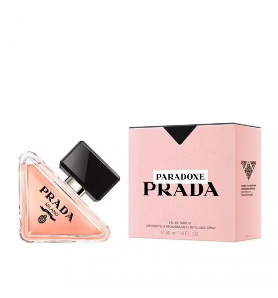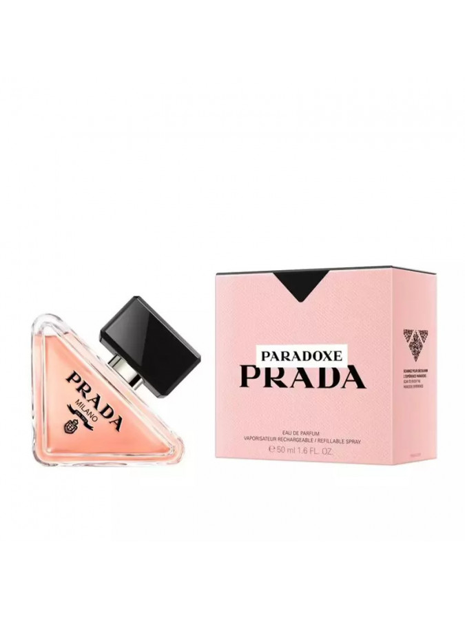 بتغليف جوهر برادا، تعيد زجاجة Paradoxe القابلة لإعادة التعبئة اختراع الرمز الأكثر شهرة للعلامة التجارية: شعارها المثلث. تم تلطيف الشكل الجذري للزجاجة، المائلة ولكن ذات الأرضية القوية، من خلال زوايا مستديرة، بينما يتناقض اللون الوردي المرجاني الرقيق للعطر مع الغطاء الأسود العميق وشعار برادا.